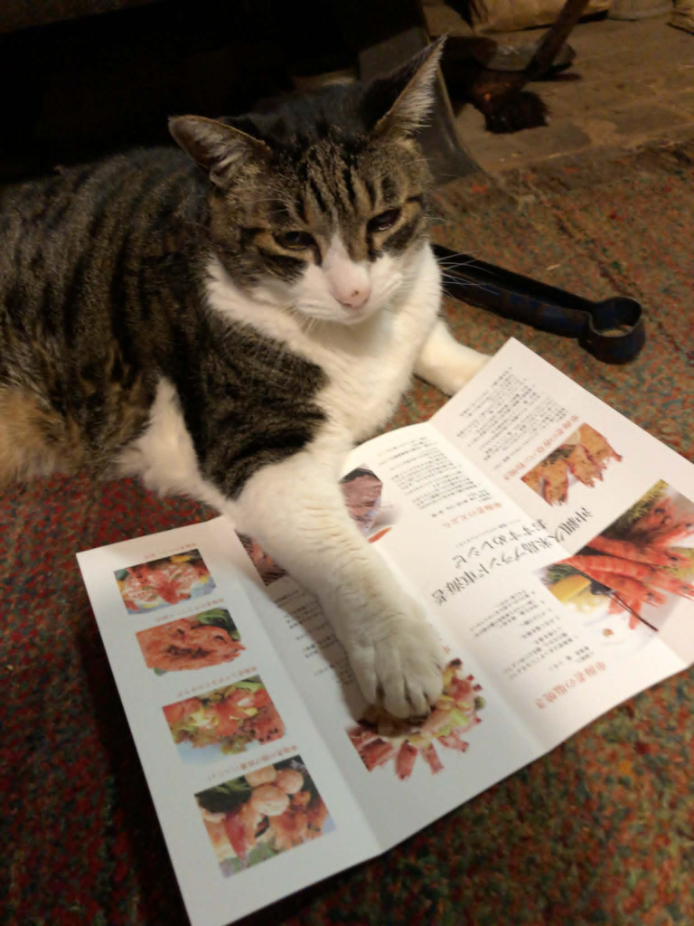 車海老の料理方法が書かれたパンフレットを見て、どの料理が美味しそうか思案するチビ太です。
