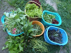 葉付きニンジン、野沢菜、トピナンブール(赤菊芋)、ラディッシュ、ジャガイモ、白菜、ベビーリーフミックス、大豆各種などなど、、