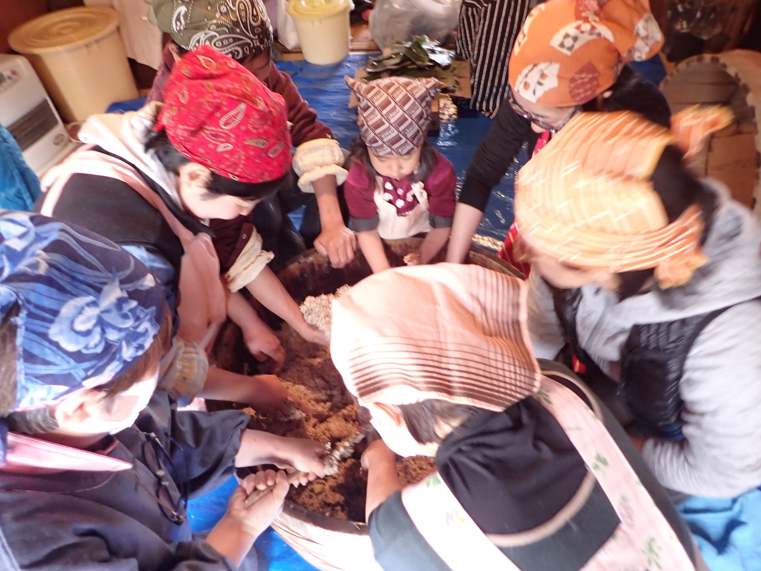 大きなお釜で大豆を煮たり、大きな木樽を囲んで大豆をつぶしたり、一緒にお昼ごはんを作って頂いたり、、