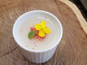 本日のスイーツは、イチゴフレークをかけた玄米甘酒プリン!