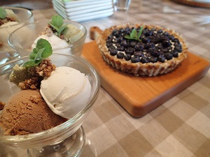・アイスクリーム3種盛り(ヘーゼルナッツのバニラアイス、ローカカオアイス、ピスタチオアイス)