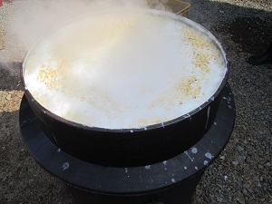 昨年とれた大豆5品種ミックスを、大きな竈でことことと煮ます。