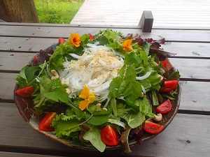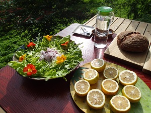 北アルプスを望む絶景と聖山の涼やかな風とともに、清らかな自然の気が流れる空間で、オーガニックの穀物やお野菜、酵素の生きたお食事を頂くことができます。