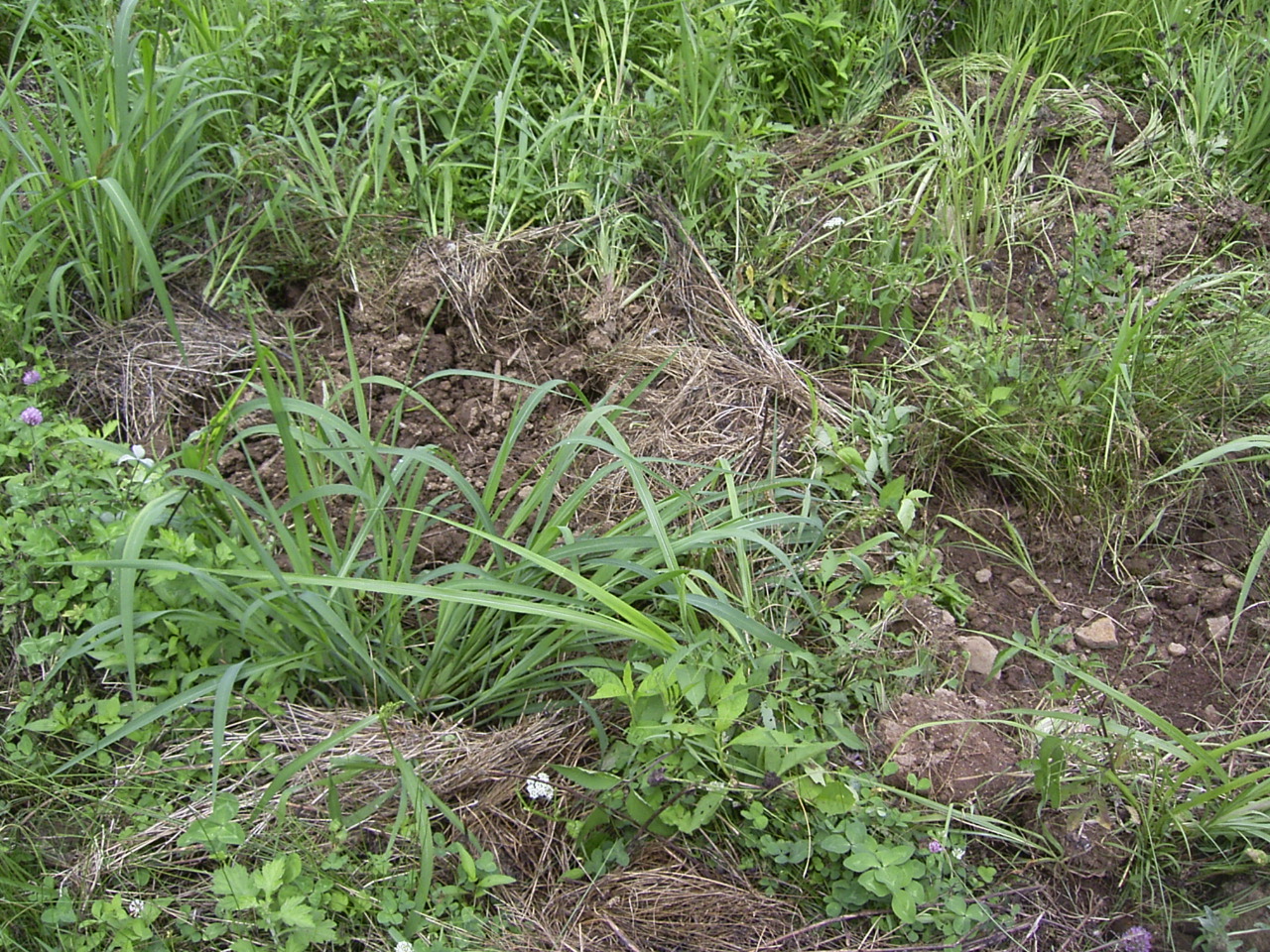 草をなぎ倒し、ミミズなどの生き物を掘るために土を掘り返した「ヌタバ」を発見。「スタバ」ではありませんよ、「ぬたば」と言います。。
