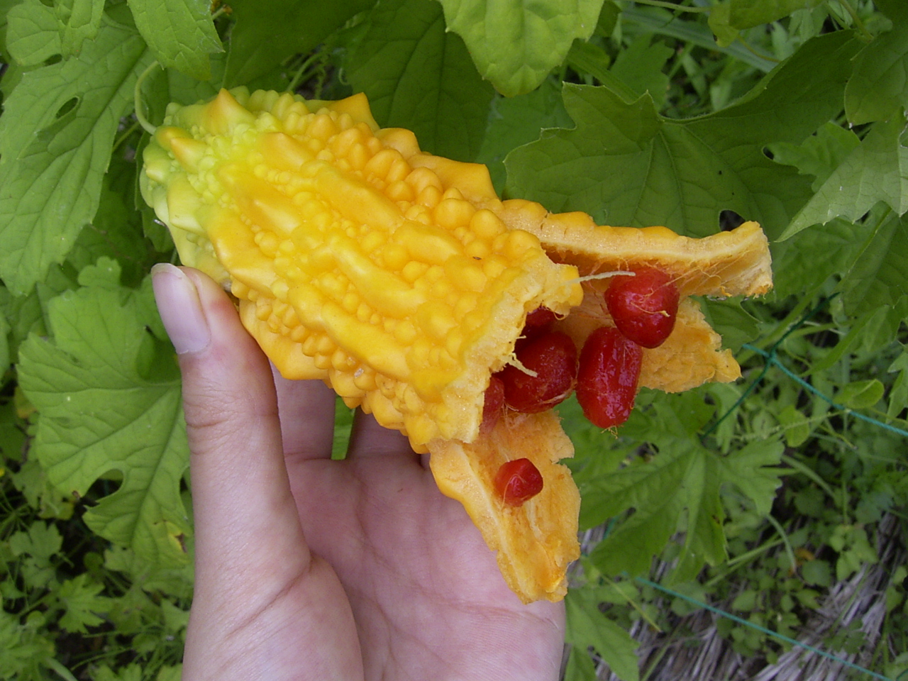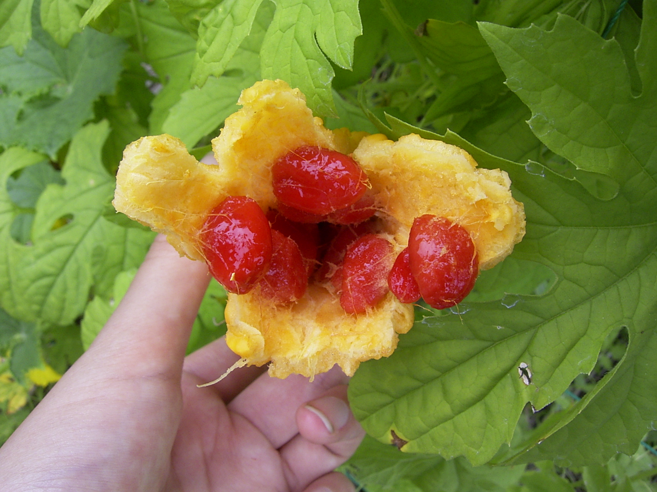 実はこれはゴーヤの種です。ほろ苦いゴーヤですが、この種の周りの真っ赤な部分、スイカのような甘さがあって美味しいのです。