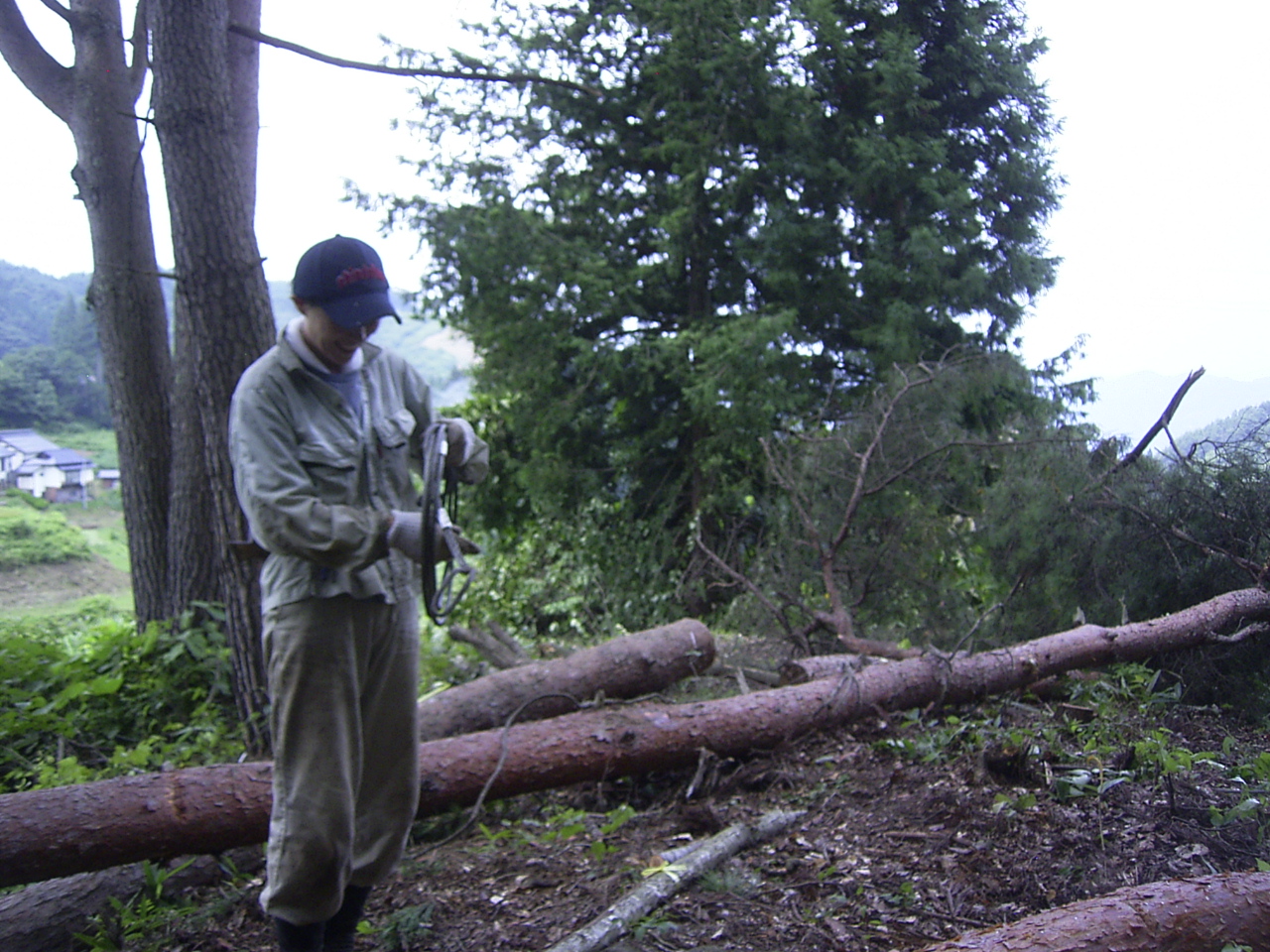 大きなアカマツの木をチルホールを使って倒します。