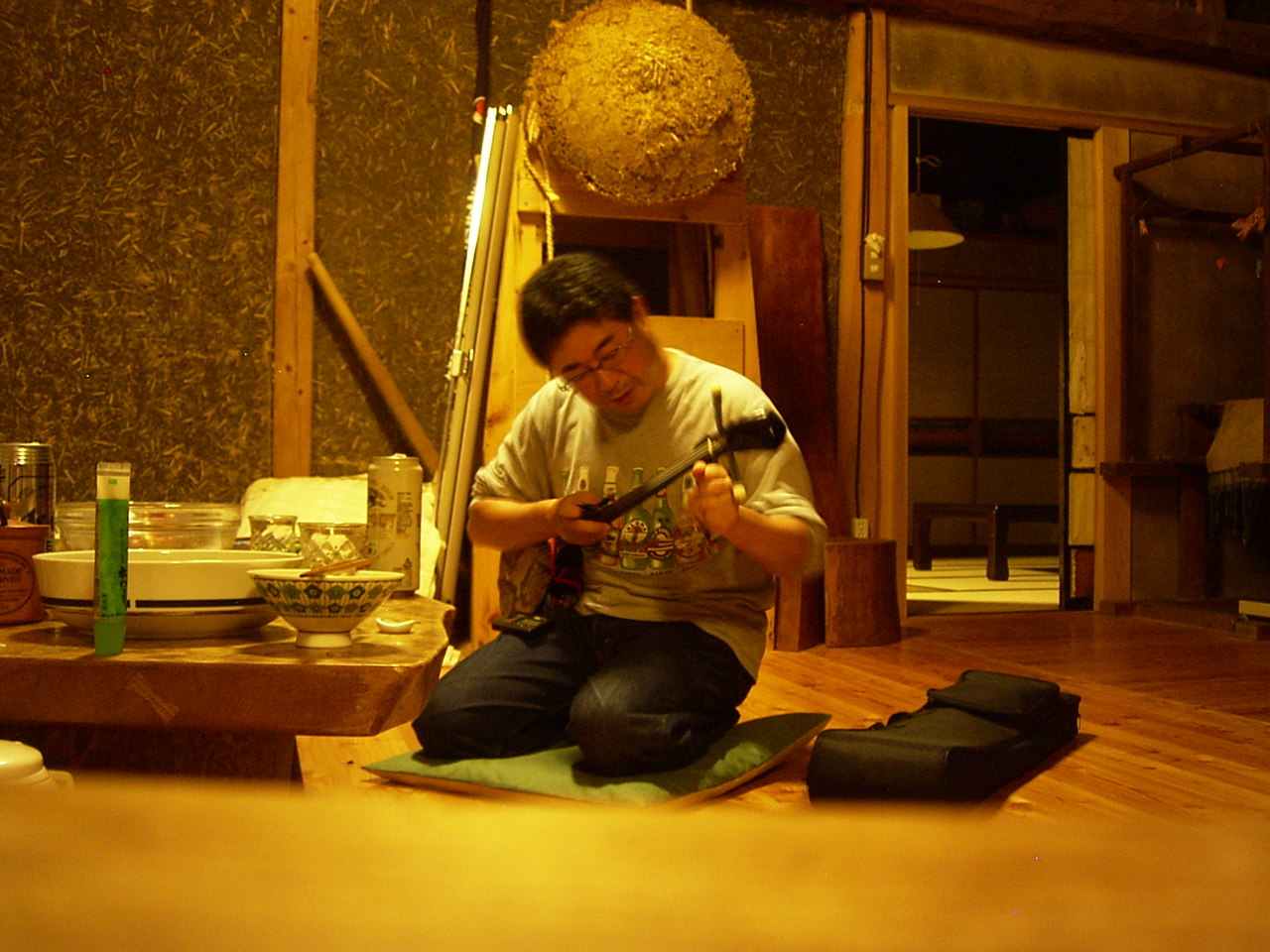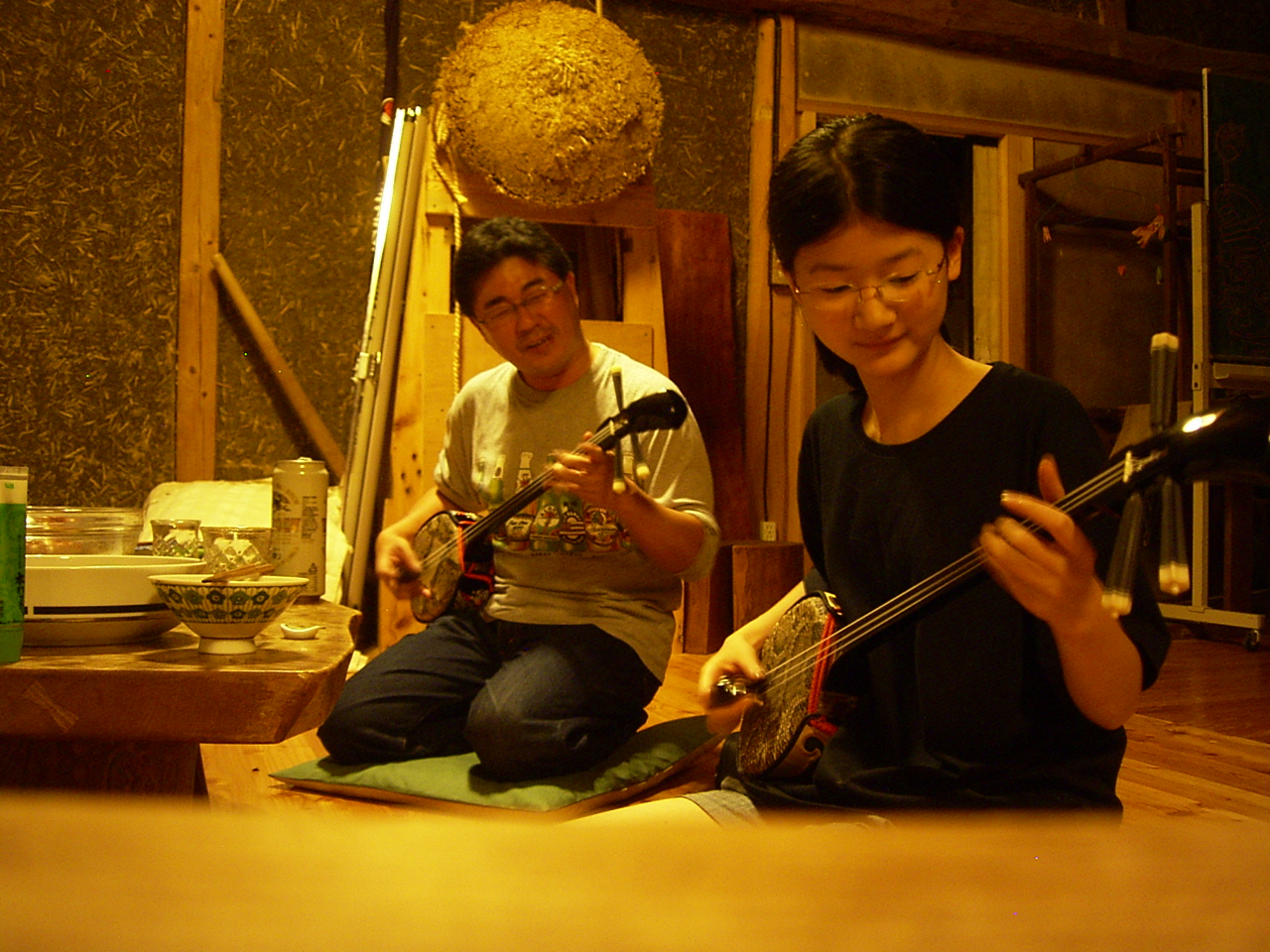 なんでも、東京のボス!から「サンシンを持って行くように!」との厳命が下ったとのことで(笑)・・・はるかこの信州の山奥で、沖縄サンシンの音色が響く夕べとなりました・・。