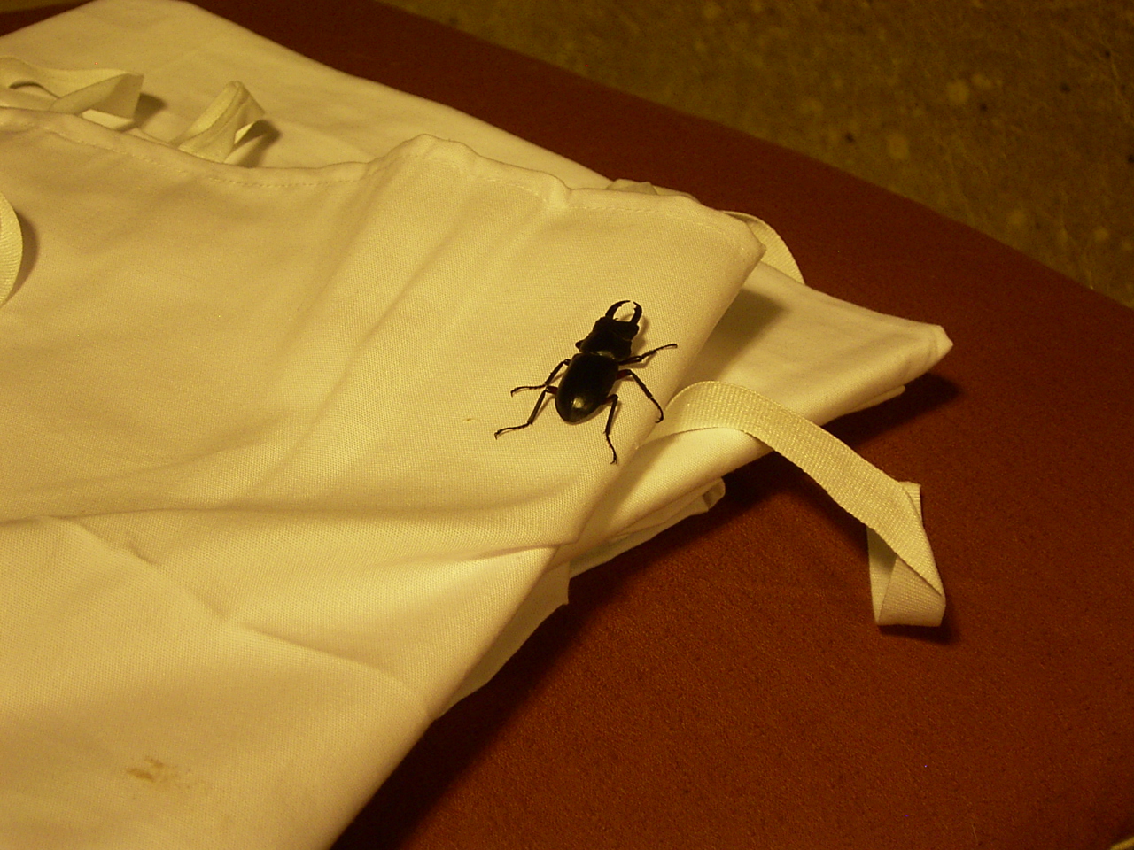 コクワガタさんは、お客様のシーツで落ち着かれておりまして・・「今夜は一緒に寝ます」と、お客様。。。