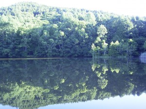 今朝の白樺湖は、朝日に輝き、水面が鏡のようでした。