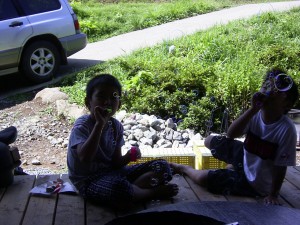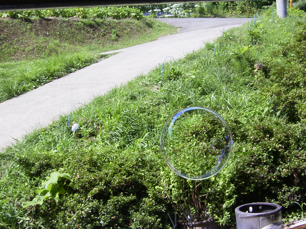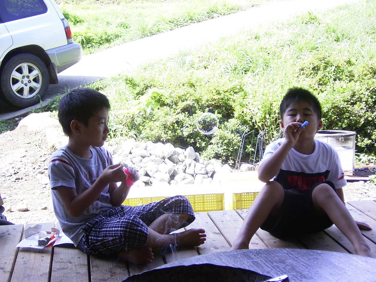 朝ご飯の後、子どもたちはシャボン玉遊びを始めました。