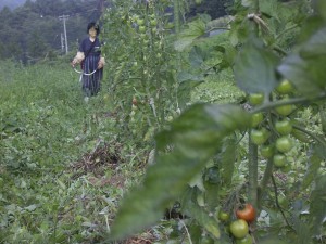 草の陰になりながらも、ミニトマトが少し赤くなり始めました。。