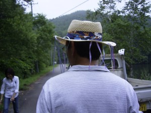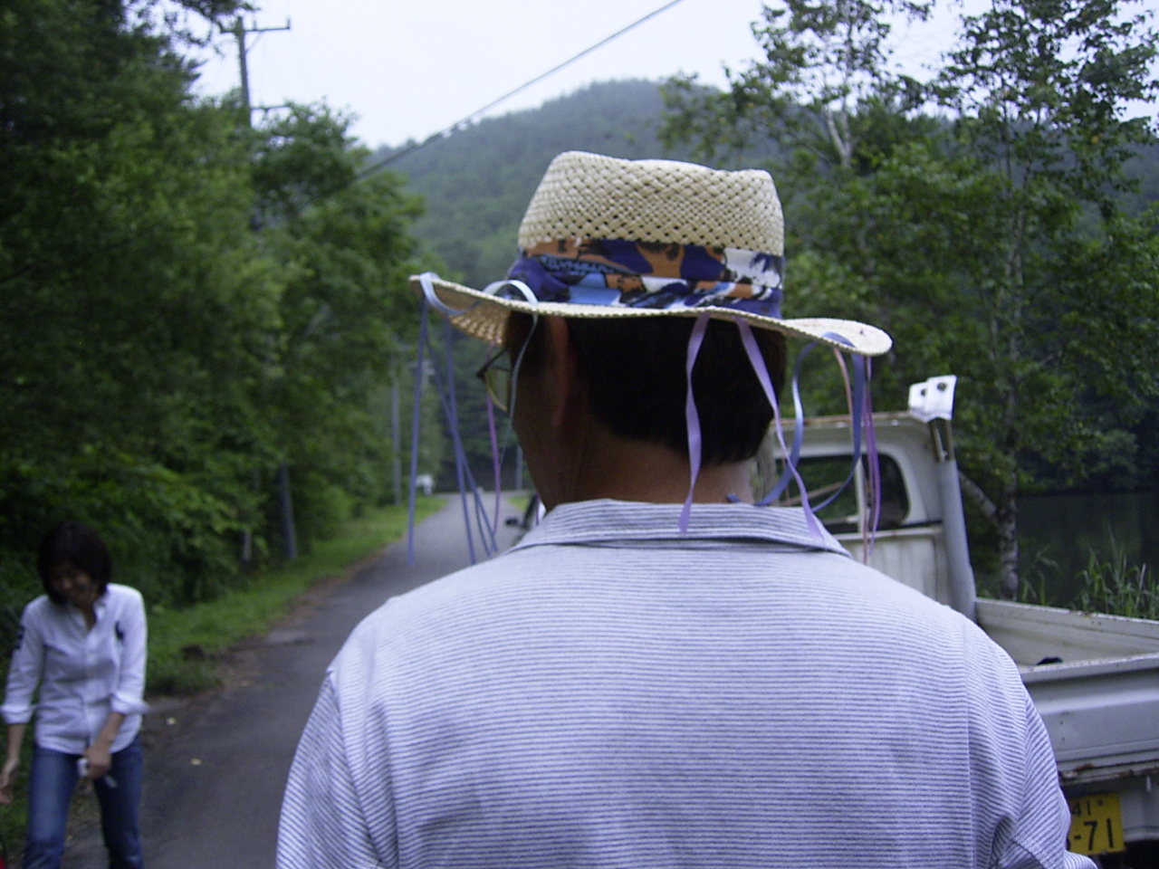 そこへ、ちょっと怪しげな!?おじ様が犬の散歩でご登場。帽子に、ひらひらとリボンがぶら下がっているのです。。