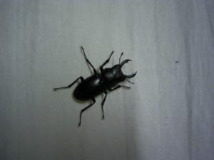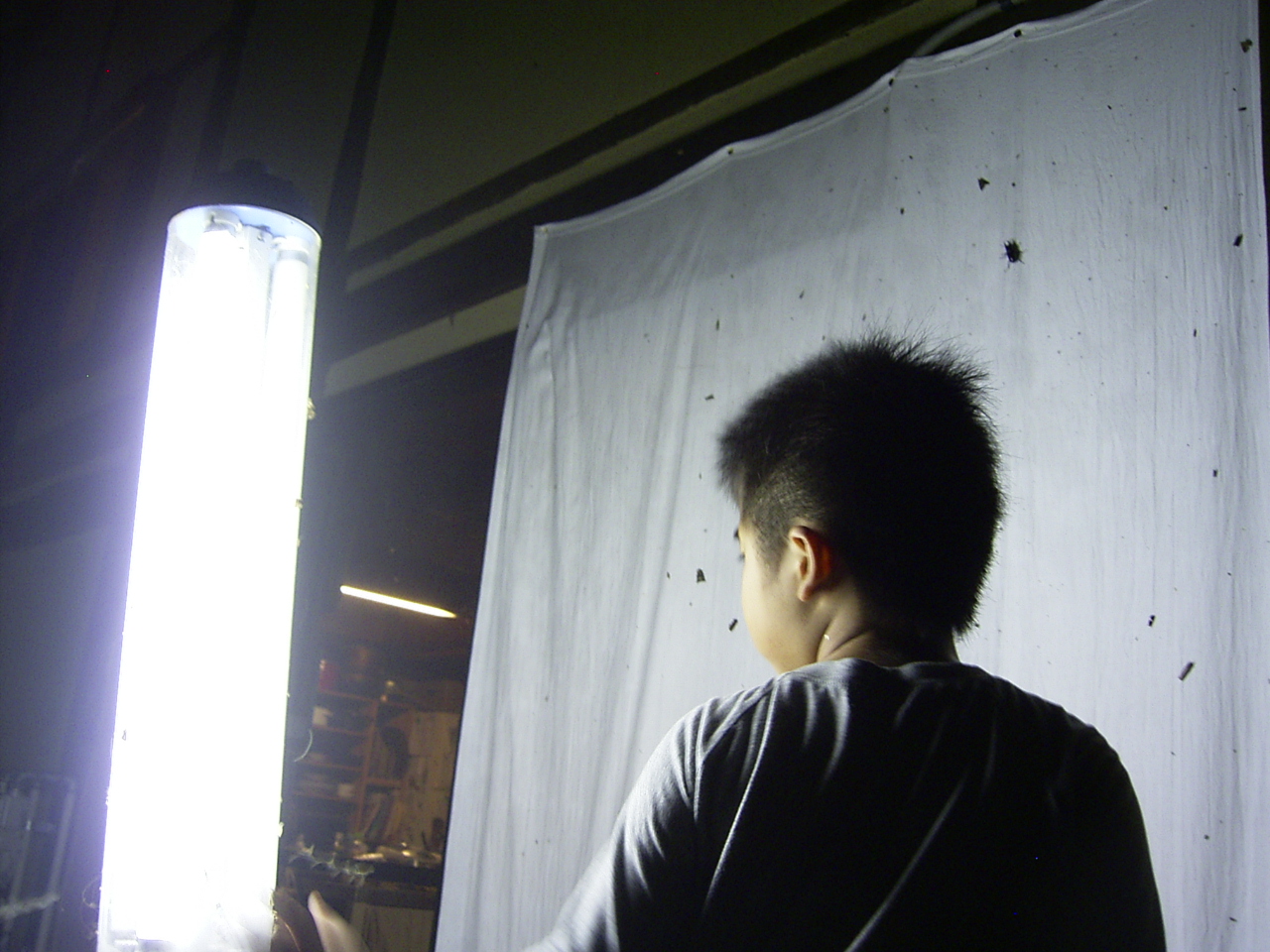 本日最後のお楽しみは、ライトトラップに集まる虫たち。もちろん男の子たちの目的はカブトムシやクワガダムシです。お約束通りに?クワガタムシが2匹来てくれましたよ!