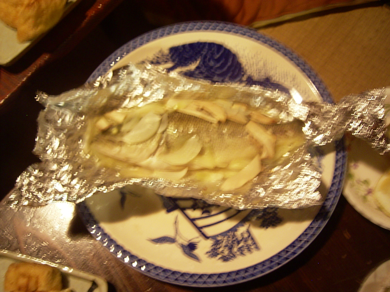 ブラックバスは、塩コショウをしてエリンギ、ニンニク、オリーブオイルでホイル焼きになりました。写真がピンボケですみません。。