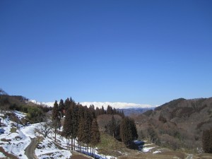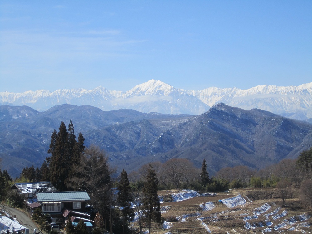 白馬三山を望む慶師集落の雪融けも進んでいます・・。