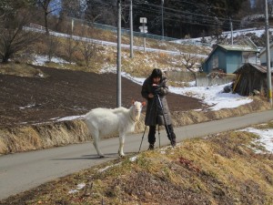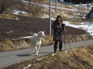 米田和集落にて放し飼いのヤギさんが・・・高須嬢にスリスリと・・・