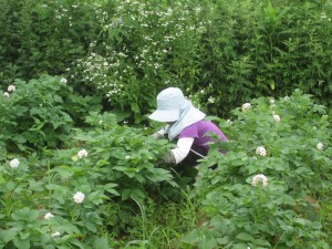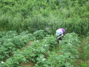 まずは、ジャガイモ畑でニジュウヤホシテントウという害虫を潰す作業をしました。