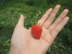 野生化したイチゴ畑では、今年最後のイチゴの実を発見!
