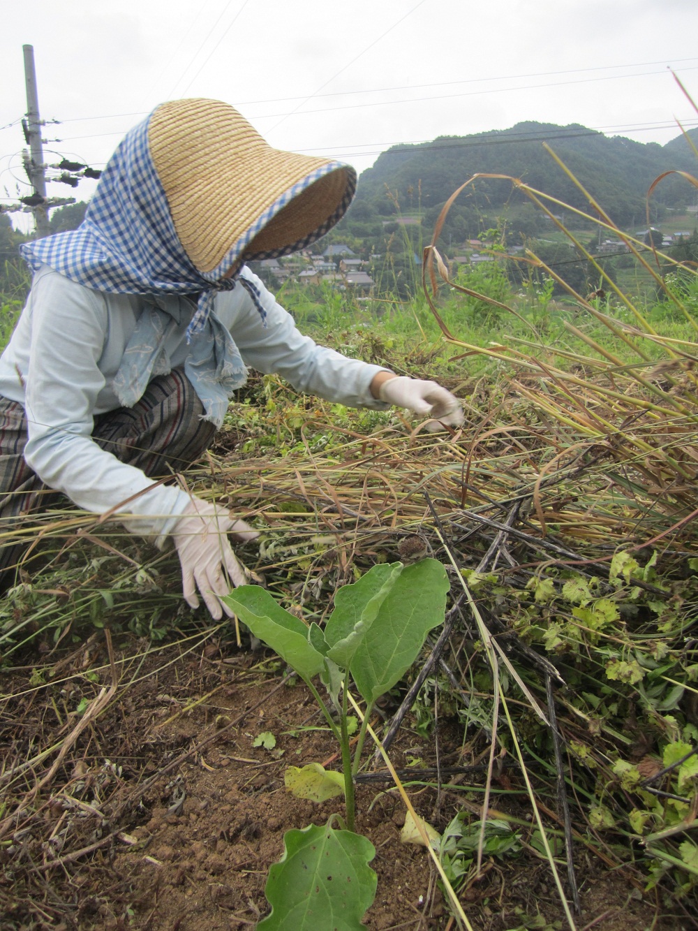 刈った草を、ナスの苗の周りに敷きます。草マルチです。