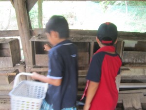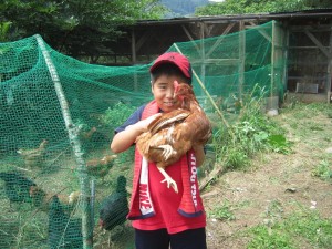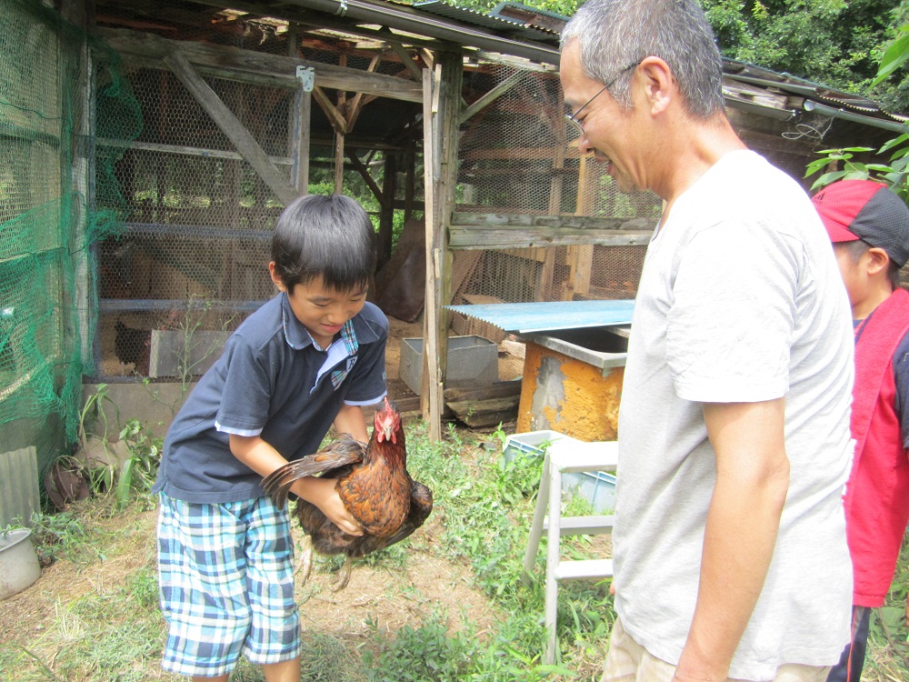 初めてニワトリを抱く百くんと敬大くん。おっかなびっくりですが、頑張りました!