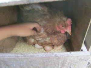 ニワトリのお腹の下で温められている卵にそーーっと手をのばします。