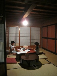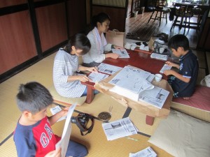 農楽里に戻りまして一休みの後で、農楽娘さんたちと百くん、敬大くんが、出来立てほやほやの「かわら版農楽里」を折る作業を手伝ってくださいました。