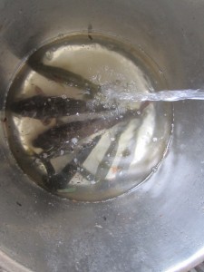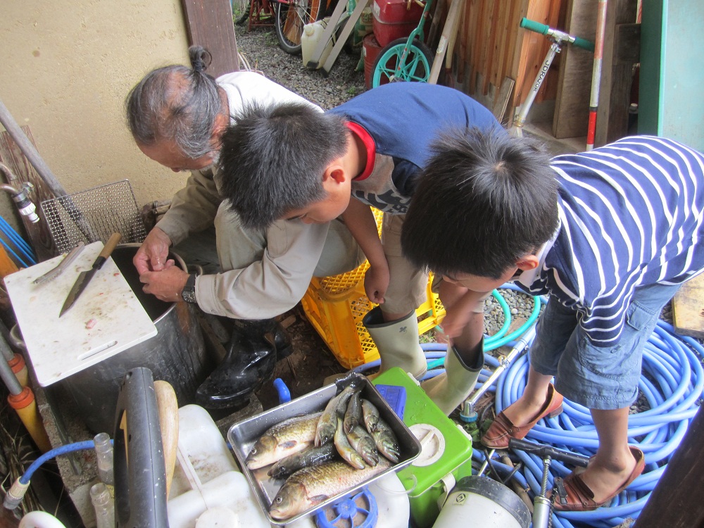 魚の腸を抜く農楽父さんと、覗き込む子供たち。