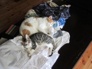 洗濯物の上で昼寝をする猫たちが・・。
