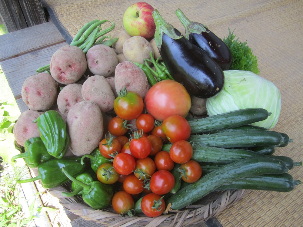 ジャガイモ(北あかり)、アンデス赤じゃが、ピーマン、キュウリ、トマト、ミニトマト、インゲン、青シソ、キャベツ、丸ナス、青トウカラシ、これに、タマネギ、赤タマネギ、ニンニクが入りました。そしておまけの減農薬早生リンゴ。