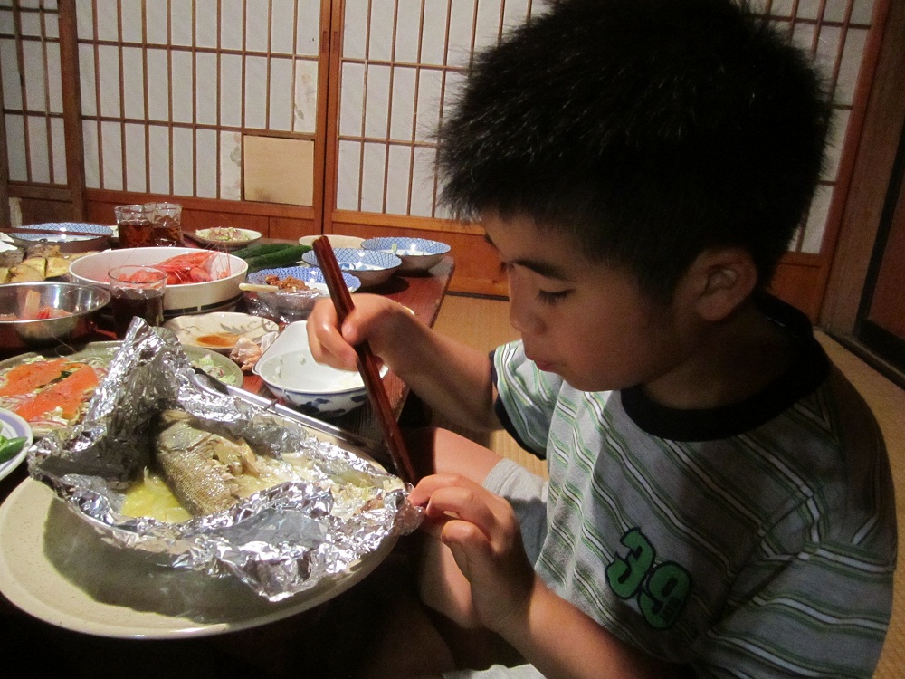 こちらは、黙々とバスのホイル焼きほおばる敬大くん。