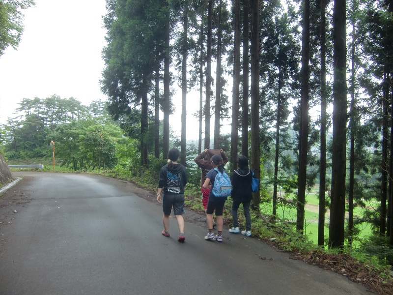 慶師入口のバス停留所から農楽里ファームまでの林道を歩く子どもたちとyou遊のお姉さん。