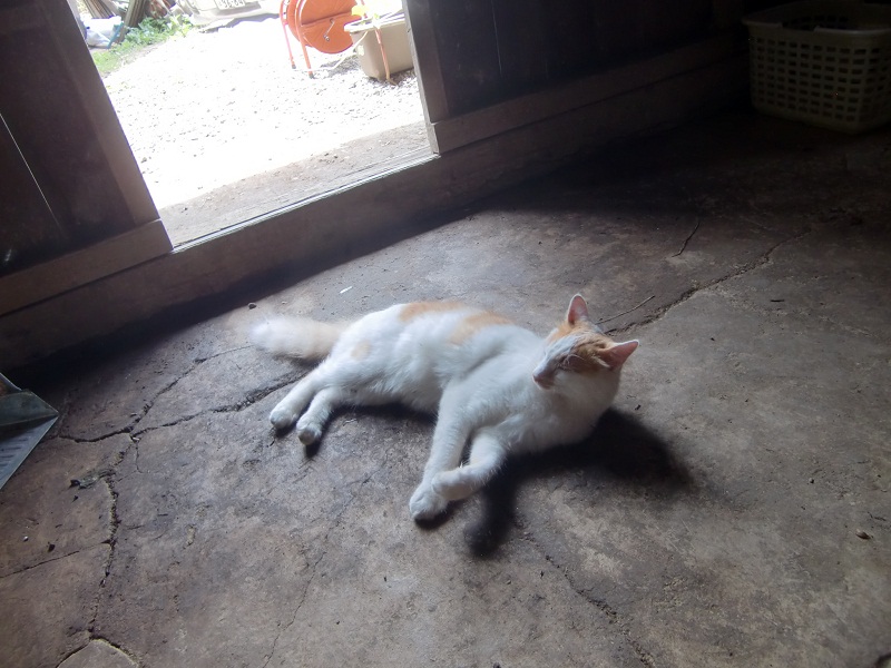 土間で涼むミコ太。あーーひんやり・・・きもちいいにゃあ。。