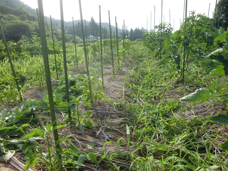 ピーマンとピーマンの間の草を刈って敷き、風を通します。