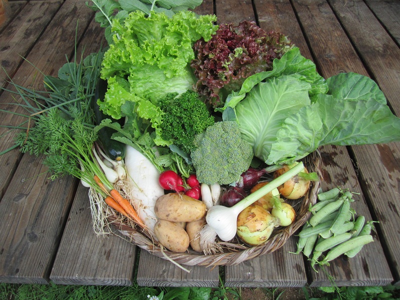 葉付き大根、サニーレタス、グリンリーフレタス、ジャガイモ、タマネギ、赤タマネギ、ラディッシュ、エシャレット、間引きニンジン、ズッキーニ、 グリンピース、キャベツ、パセリ、ニンニク