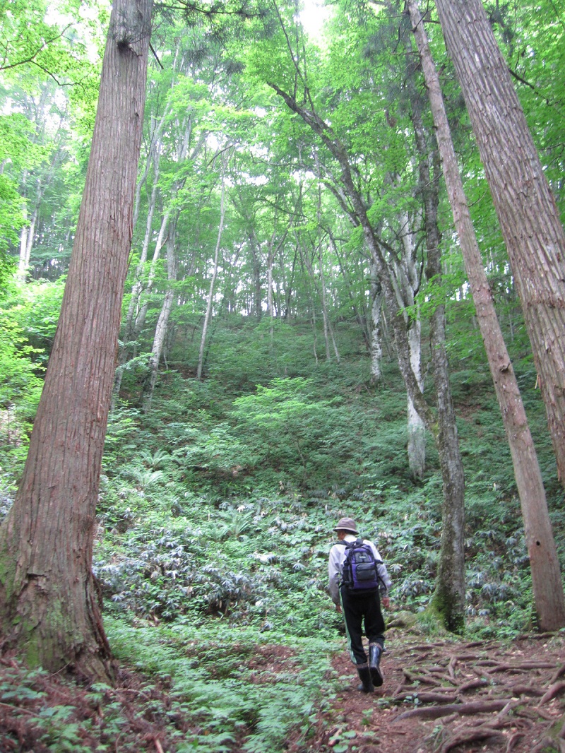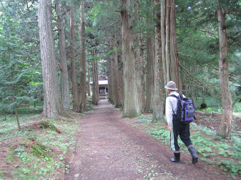 拝殿横の倒れた杉の木に腰をかけ、「大岡村史 自然編」のお話もして下さいました。