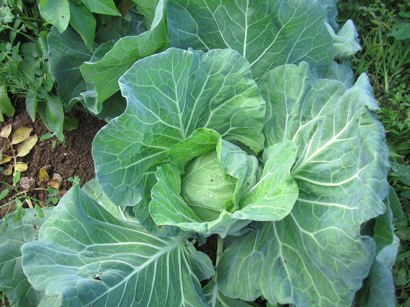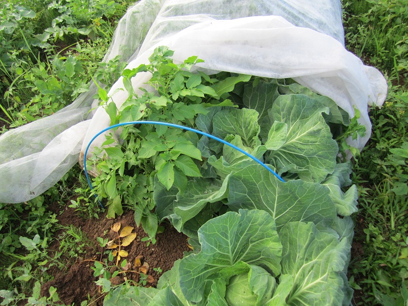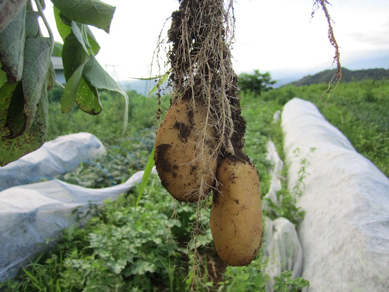 キャベツ畑では、自然生えのジャガイモも育っていました。