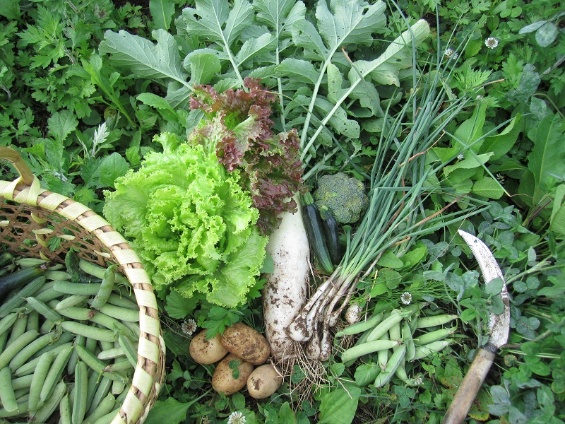草刈り作業の後で、今夜の夕飯のお野菜を収穫します。