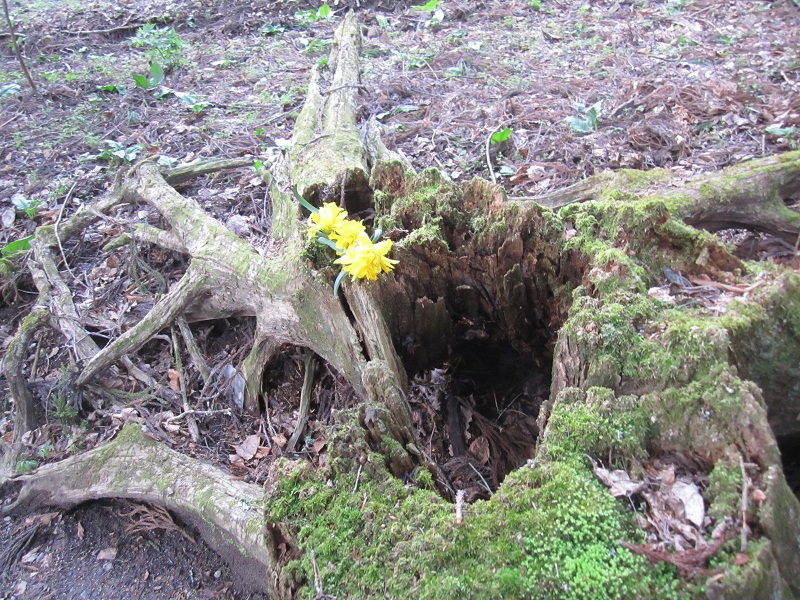そして、5月7日に境内の杉の切り株に生けてあった小さなスイセンの花、これは、やはり池内先生がなさったことでした・・。