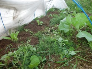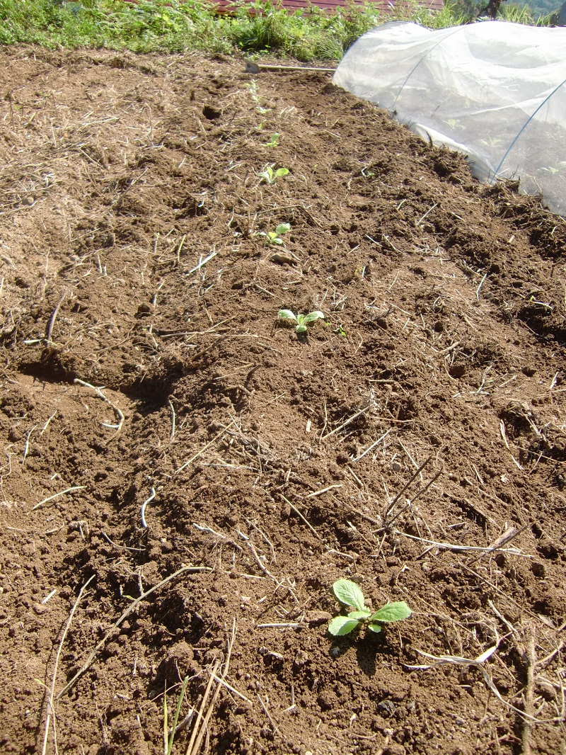 キャベツが育っているトンネルをめくってみますと、移植したはずのキャベツが半分以上消えていました!(涙)ので、その空いた所へ、まず移植です。。