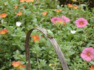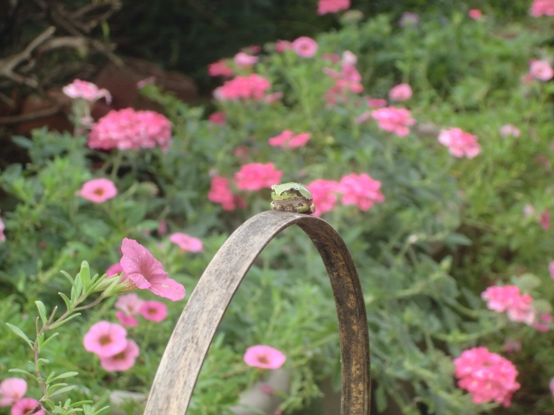 朝、お庭に出てみますと、、鉢植えの中に小さなカエルさんがちょこん。
