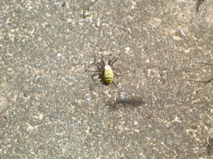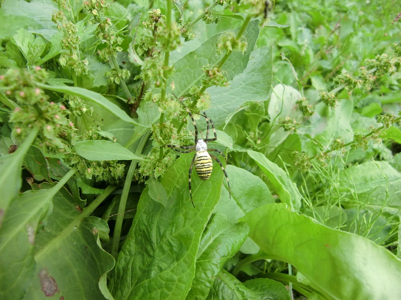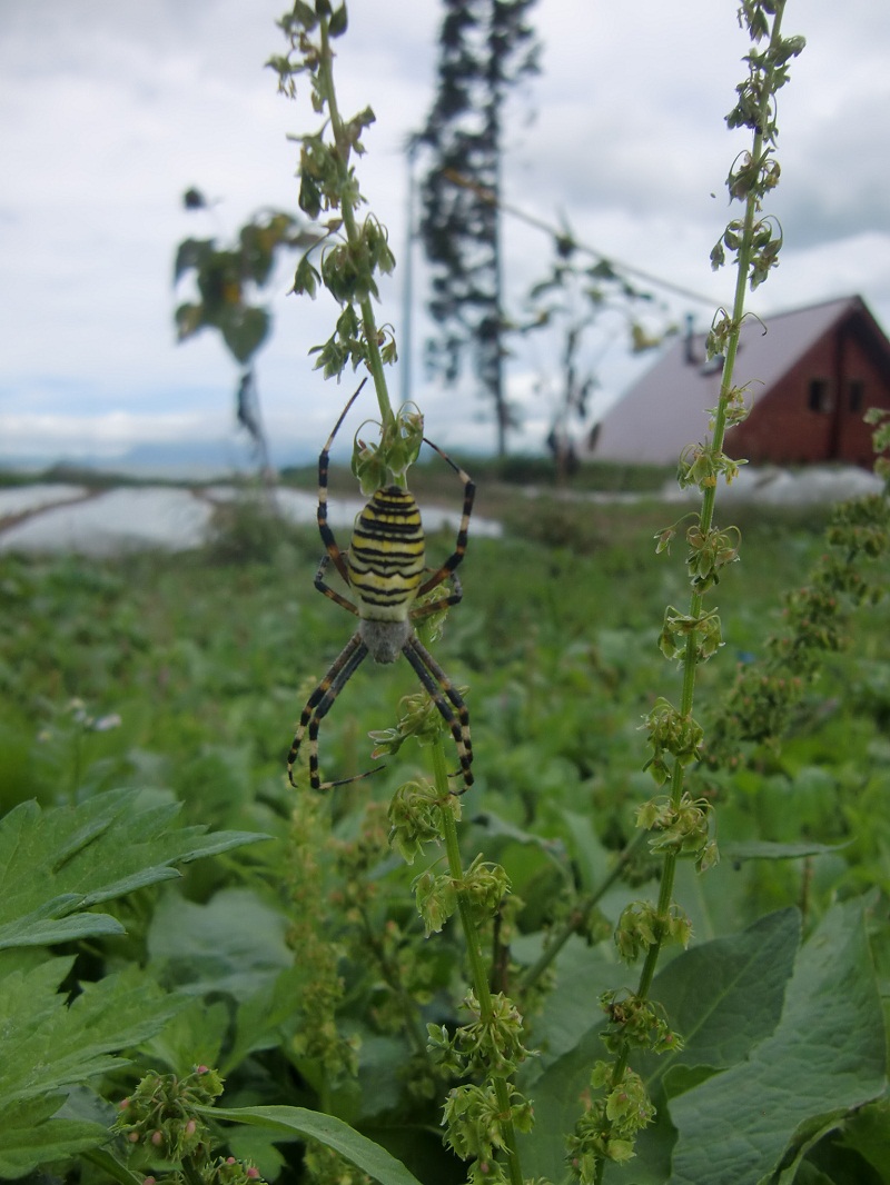 ナガコガネグモは、またまた慌てふためいて草むらの中で落ち着く先を探し歩きました。。