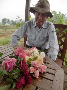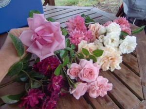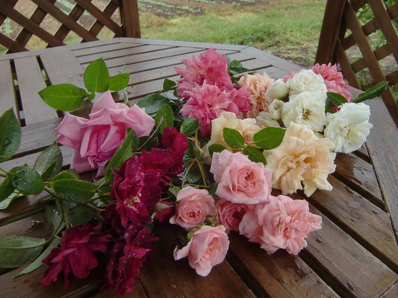 農業体験参加者の皆さんのための食堂棟の前庭に、 古い土壁を活かしたその建物に調和する出来るだけナチュラル な楚々としたバラを幾つか植栽されたい由‥生憎の雨模様でしたが、 ファームのあちこちで咲いていた花々をカットして、東屋のテーブルに 並べて御覧頂きました。