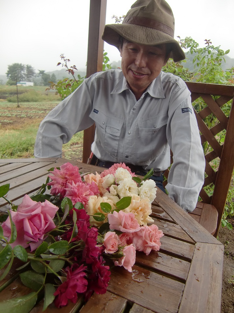 そして、農楽里ファーム母屋周辺の景観の写真をご覧になって、「あの雰囲気に合うものならこれかな、、」、とお勧めの花を、雨の中いくつも切って持ってきて来て下さいました。。