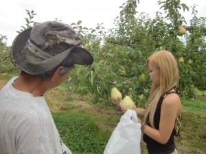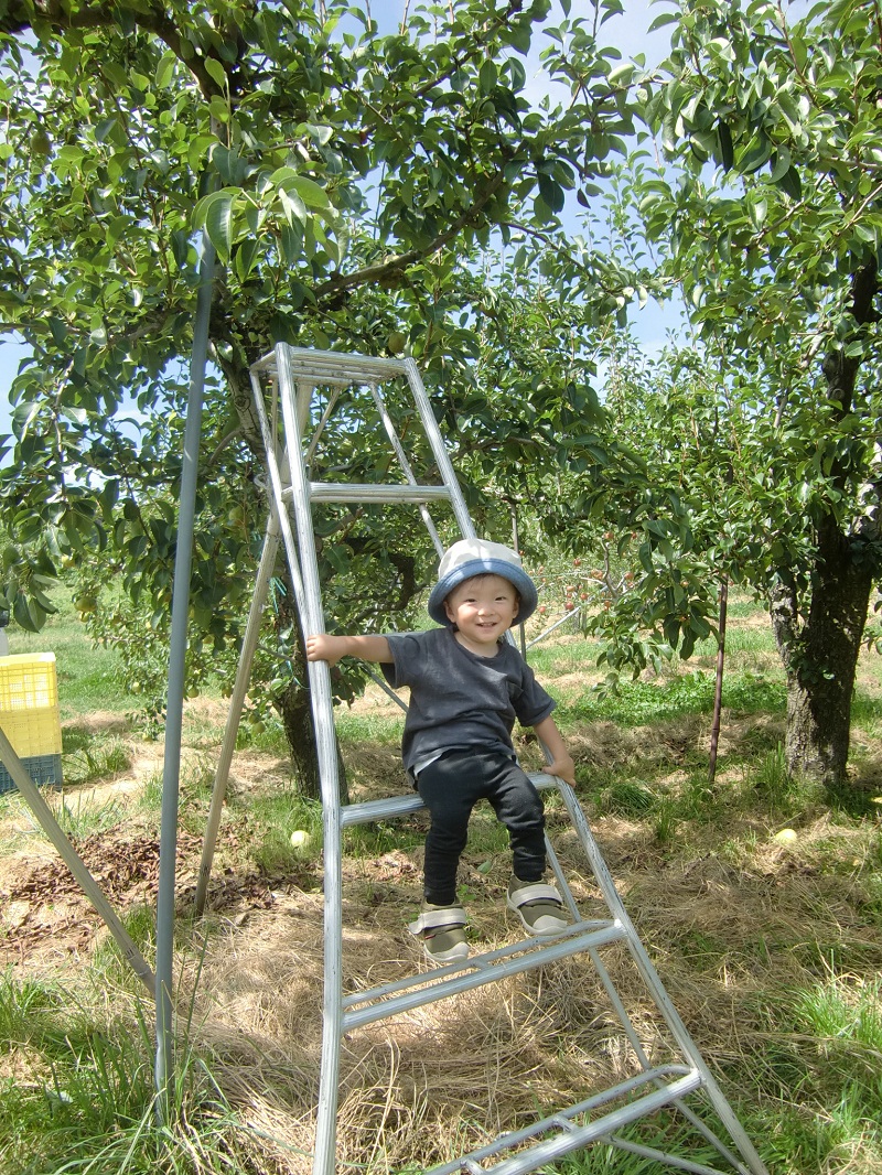 ちょうど収穫時期を迎えている洋ナシ、マルゲリット・マリーラを手にするのは、あかりちゃん。