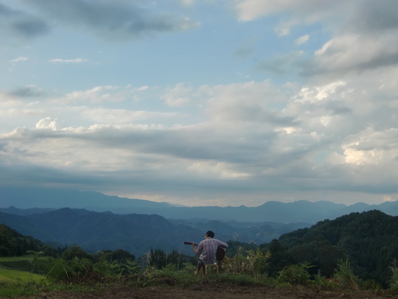夕暮れ前、畑でお野菜の種まきをしている農楽母さんの横でギターを弾く農楽息子です。。