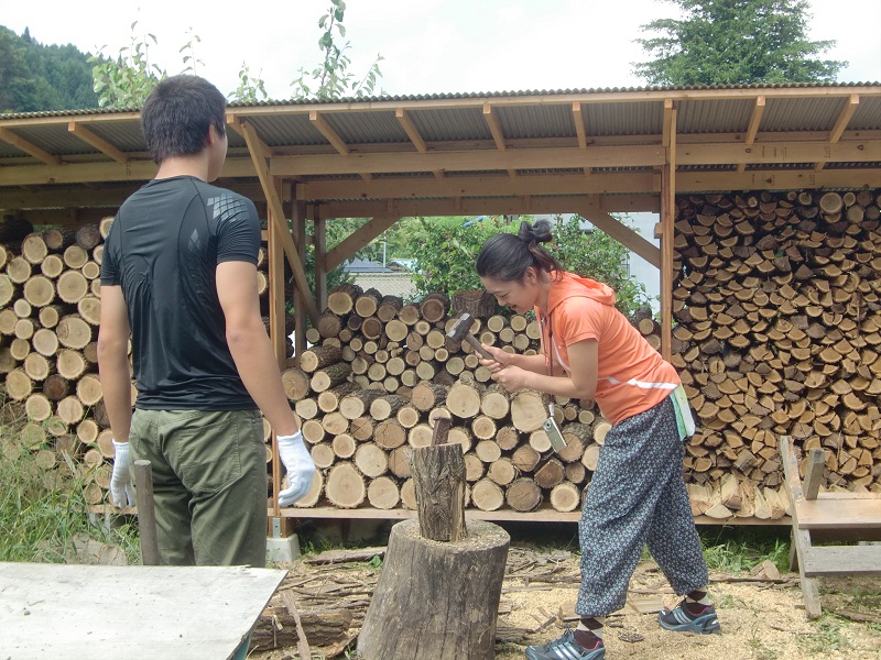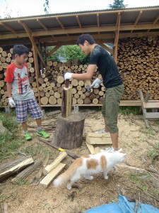 午前中は、農楽息子の指導による薪割り体験です。