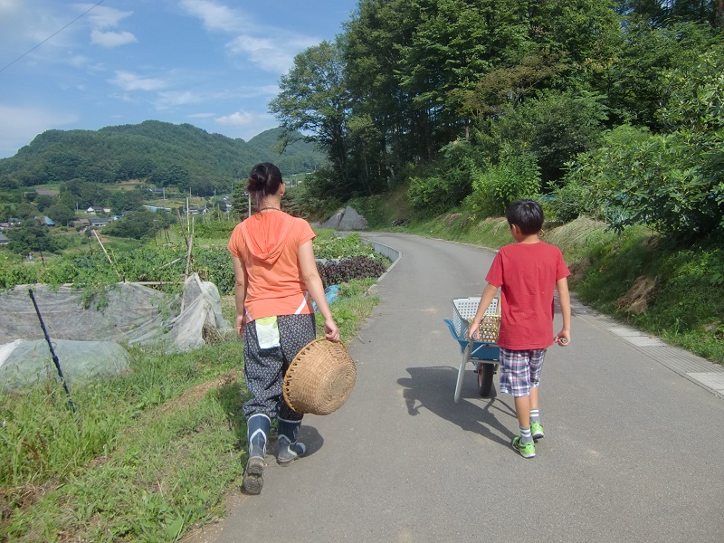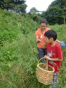 薪割りの後は、畑でトマトなど夏野菜の収穫です。