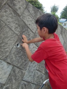 収穫を終えて一輪車で母屋へ戻る途中、百くんがブロック塀の水抜きの穴を覗き込んでいました。。