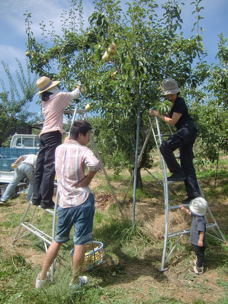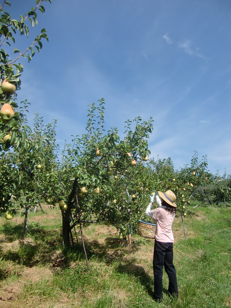 今日は、まず、トクナガリンゴ園にて、洋ナシ「マルゲリット・マリーラ」の収穫のお手伝いです。