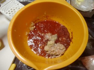 キュッと絞った白菜に、ヤンニョムを揉みこんでいきます。